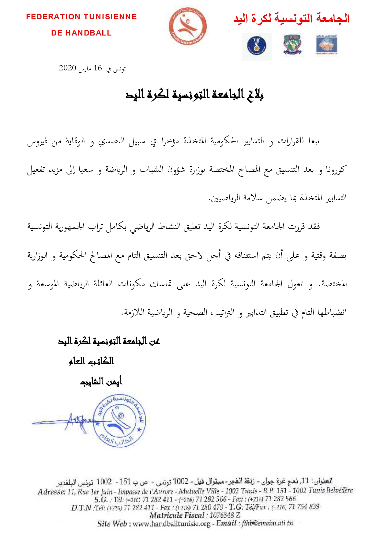 إيقاف كل مقابلات كرة اليد 16 mars 2020 Communiqués, Désignations, Featured, Les News de la FTHB, Photo, Publications Partager Facebook Twitter Google + Partager :Cliquez pour partager sur Twitter(ouvre dans une nouvelle fenêtre)Cliquez pour partager sur Facebook(ouvre dans une nouvelle fenêtre)Cliquez pour partager sur Google+(ouvre dans une nouvelle fenêtre) Articles similaires Partager Facebook Twitter Google +