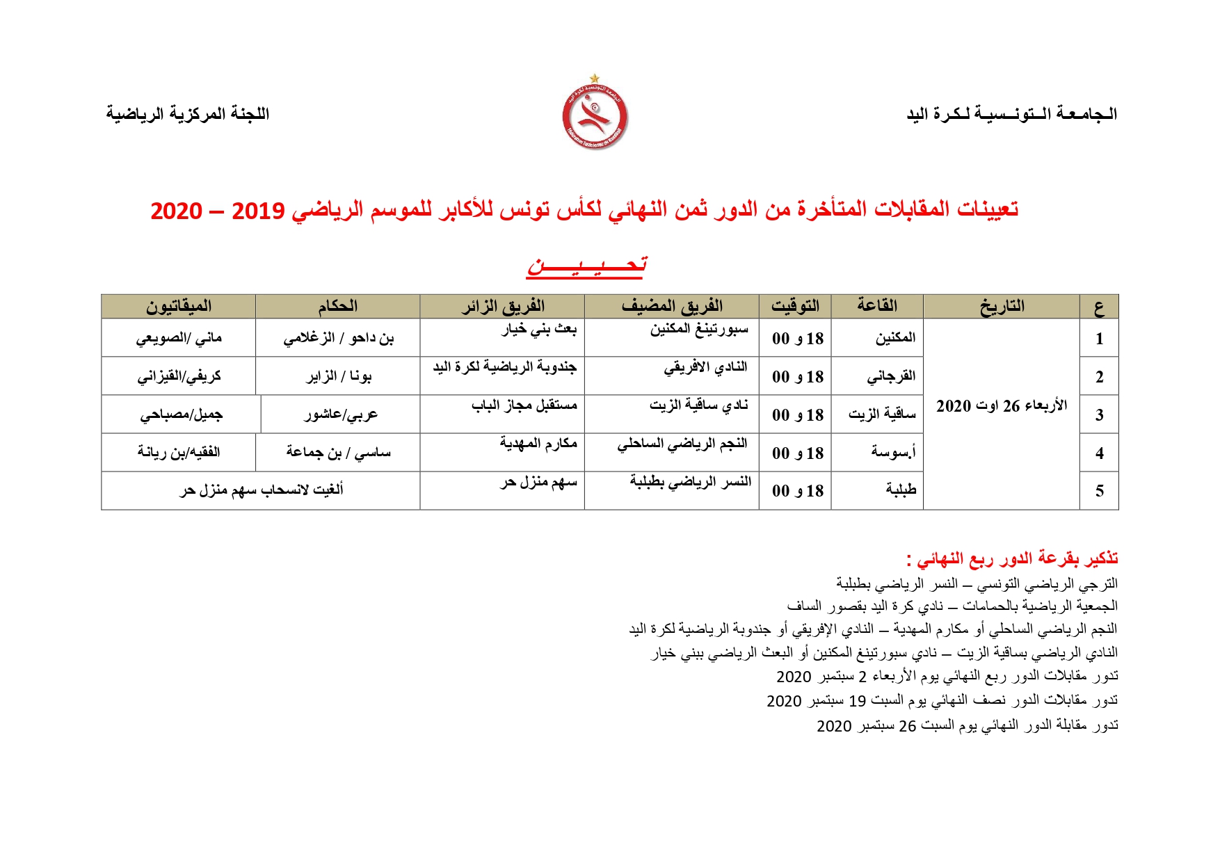 Coupe de Tunisie Seniors Hommes : Désignation des Arbitres des Matchs en Retard des Huitièmes de Finale