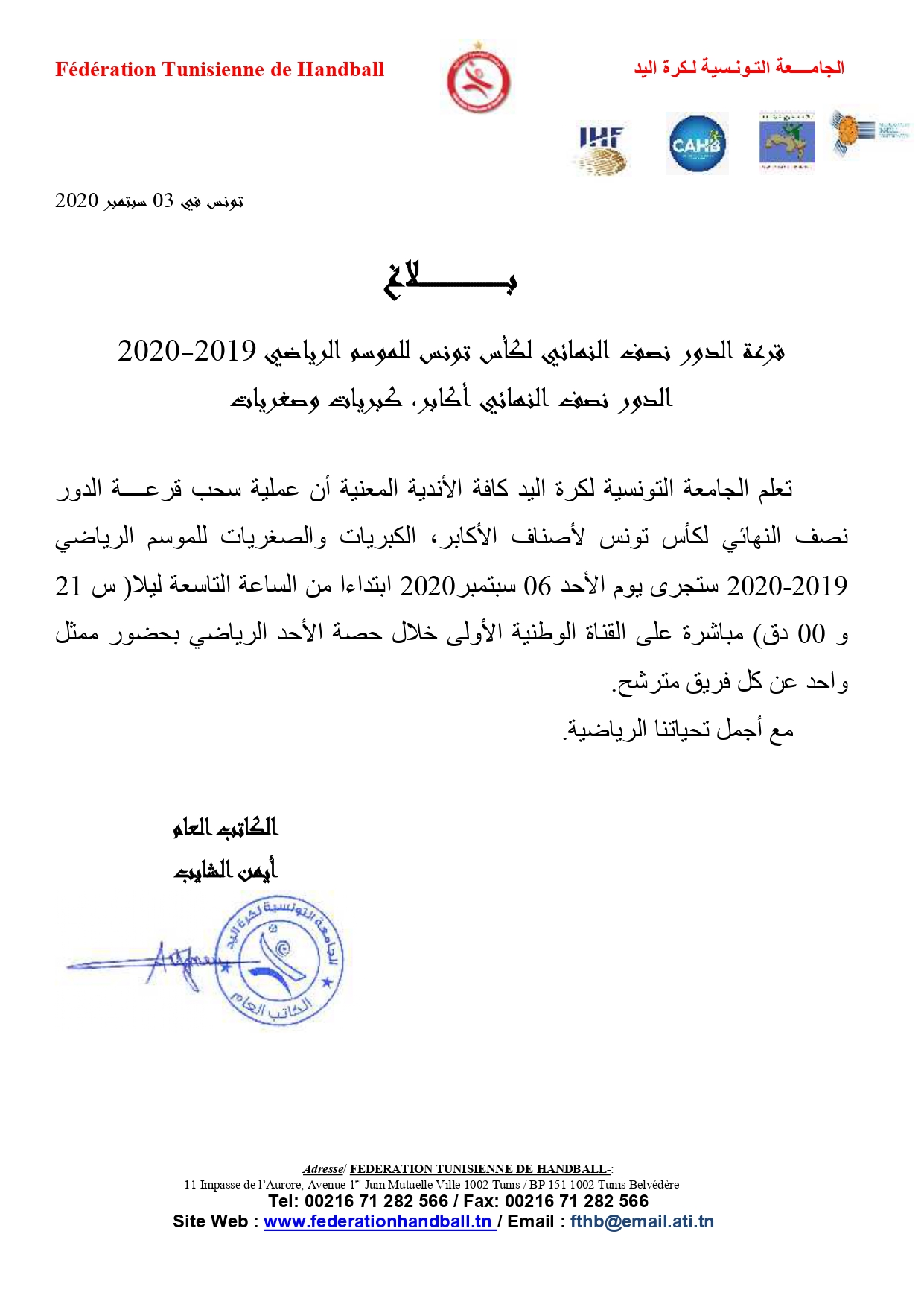 Communiqué tirage au sort demi-finales Coupe de Tunisie Seniors Hommes, Dames & Cadettes Filles 3 septembre 2020 Communiqués, Désignations, Featured, Les News de la FTHB, Photo, Publications Partager Facebook Twitter Google + Partager :Cliquez pour partager sur Twitter(ouvre dans une nouvelle fenêtre)Cliquez pour partager sur Facebook(ouvre dans une nouvelle fenêtre)Cliquez pour partager sur Google+(ouvre dans une nouvelle fenêtre) Articles similaires Partager Facebook Twitter Google +