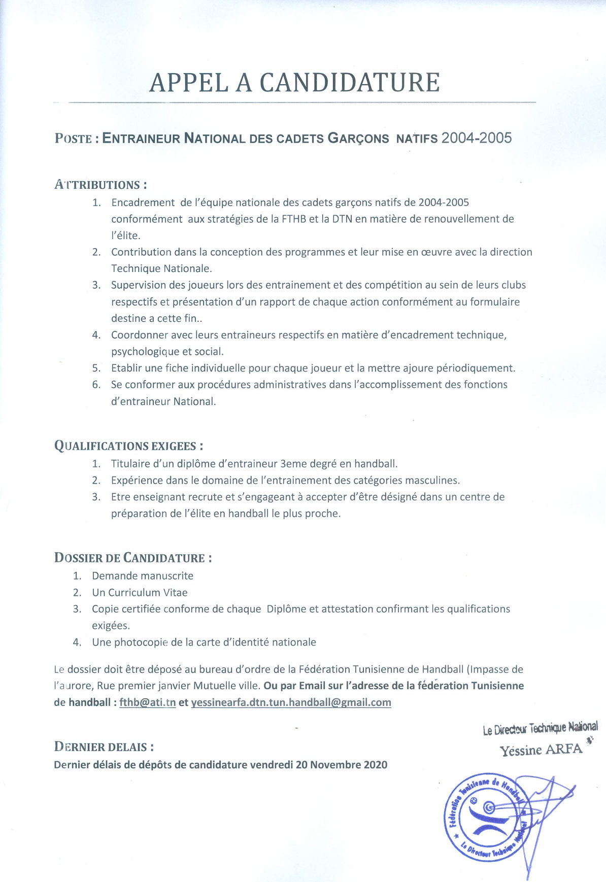Appel à Candidature pour le Recrutement d’un Entraineur National des Cadets Garçons natifs 2004-2005 12 novembre 2020 Communiqués, Désignations, Featured, Les News de la FTHB, Photo, Publications Partager Facebook Twitter Google + Partager :Cliquez pour partager sur Twitter(ouvre dans une nouvelle fenêtre)Cliquez pour partager sur Facebook(ouvre dans une nouvelle fenêtre)Cliquez pour partager sur Google+(ouvre dans une nouvelle fenêtre) Articles similaires Partager Facebook Twitter Google +