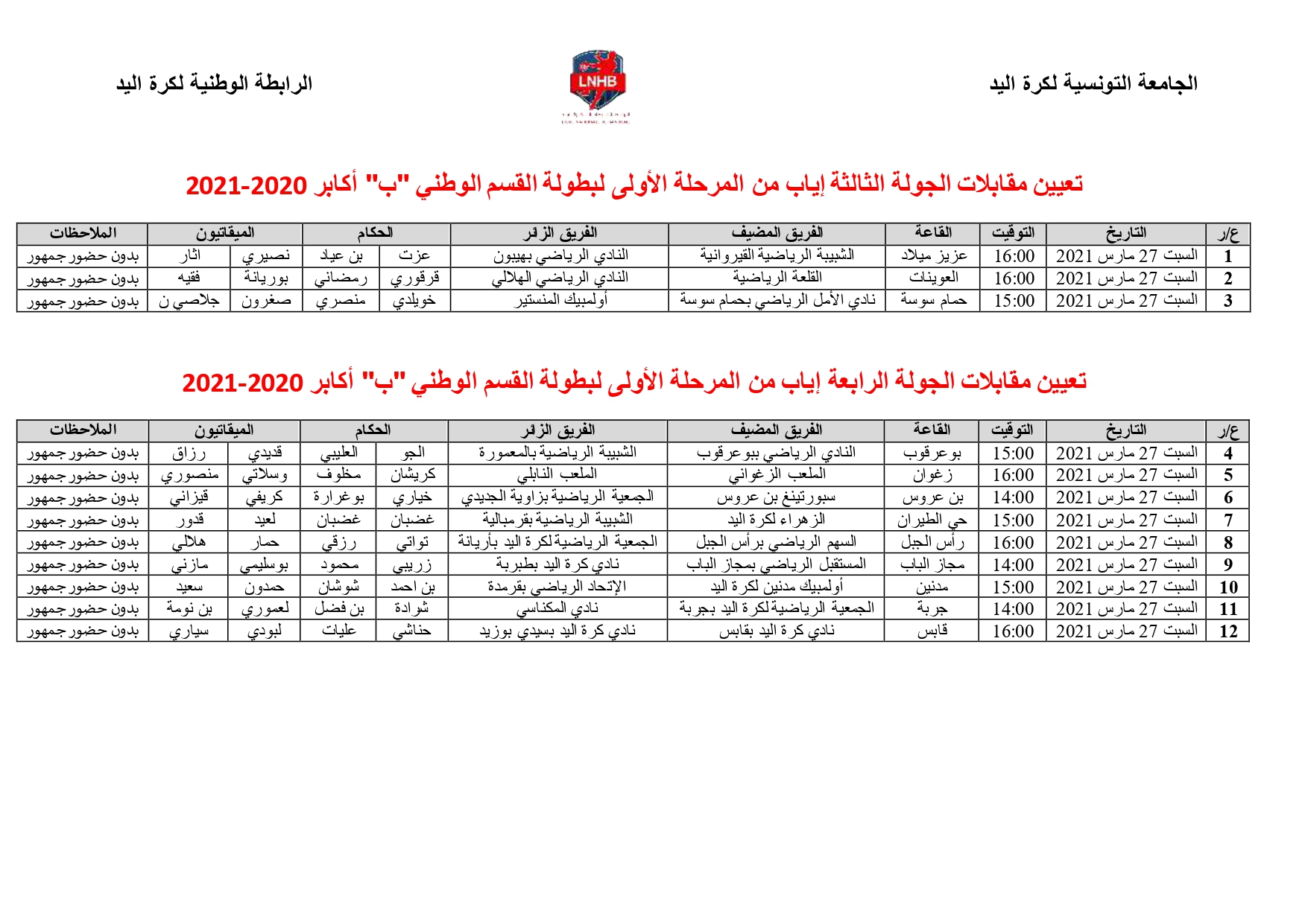 Nationale « B » Hommes : Désignation des Arbitres des matchs du samedi 27/03/2021 24 mars 2021 Communiqués, Désignations, Featured, Les News de la FTHB, Photo, Publications Partager Facebook Twitter Google + Partager :Cliquez pour partager sur Twitter(ouvre dans une nouvelle fenêtre)Cliquez pour partager sur Facebook(ouvre dans une nouvelle fenêtre)Cliquez pour partager sur Google+(ouvre dans une nouvelle fenêtre) Articles similaires Partager Facebook Twitter Google +