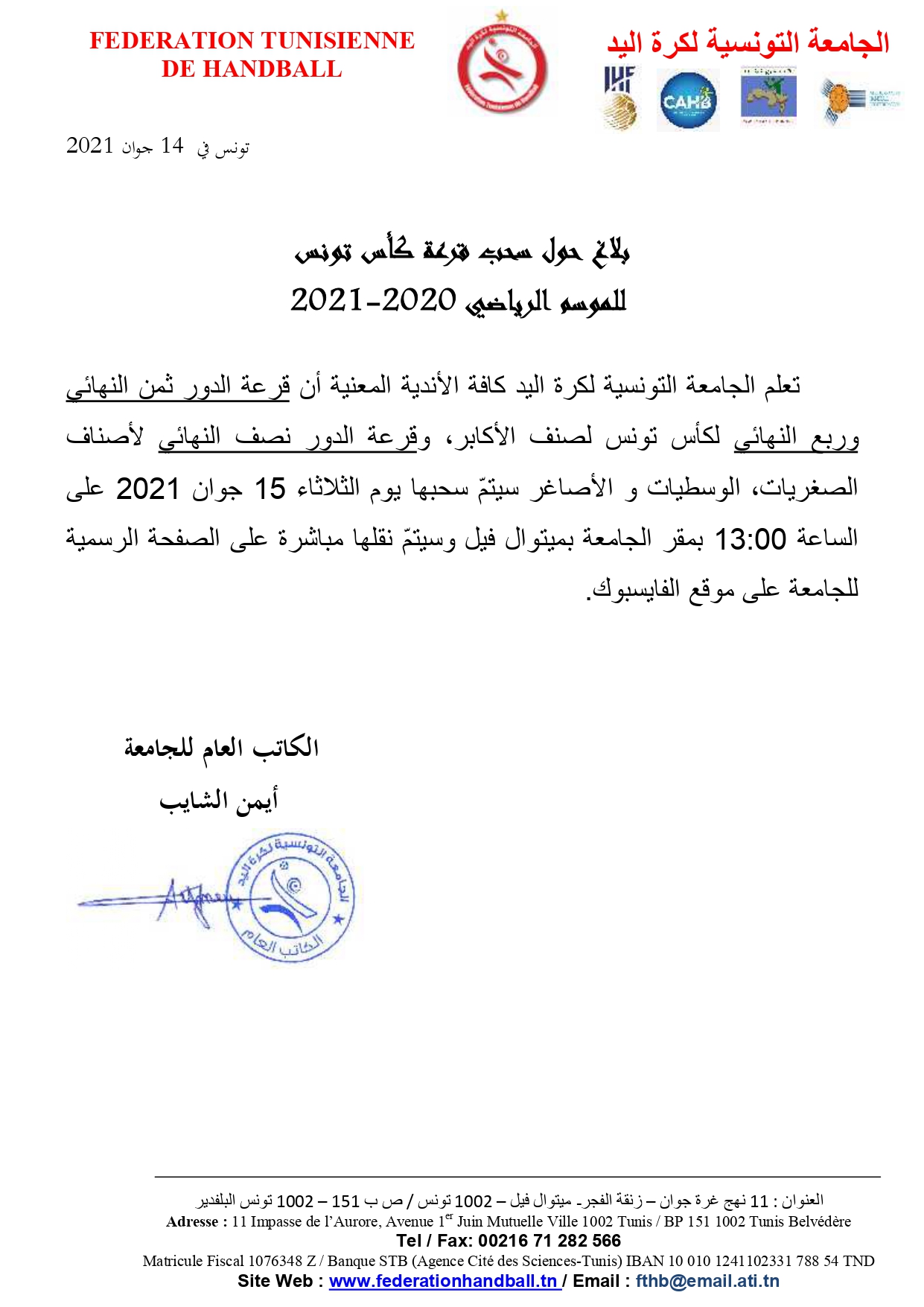 Communiqué : Tirage au Sort Coupe de Tunisie Seniors Hommes et Catégories Jeunes (Mardi 15 juin) 14 juin 2021 Communiqués, Désignations, Featured, Les News de la FTHB, Photo, Publications Partager Facebook Twitter Google + Partager :Cliquez pour partager sur Twitter(ouvre dans une nouvelle fenêtre)Cliquez pour partager sur Facebook(ouvre dans une nouvelle fenêtre)Cliquez pour partager sur Google+(ouvre dans une nouvelle fenêtre) Articles similaires Partager Facebook Twitter Google +