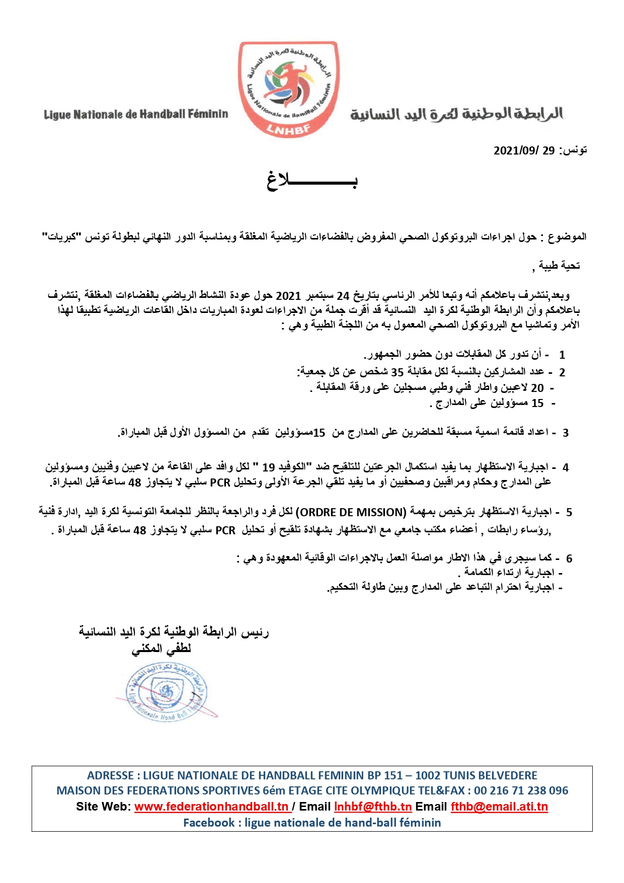 بلاغ الرابطة الوطنية لكرة اليد النسائية بمناسبة تنظيم الدور النهائي للبطولة 30 septembre 2021 Communiqués, Désignations, Featured, Les News de la FTHB, Photo, Publications Partager Facebook Twitter Google + Partager :Cliquez pour partager sur Twitter(ouvre dans une nouvelle fenêtre)Cliquez pour partager sur Facebook(ouvre dans une nouvelle fenêtre)Cliquez pour partager sur Google+(ouvre dans une nouvelle fenêtre) Articles similaires Partager Facebook Twitter Google +