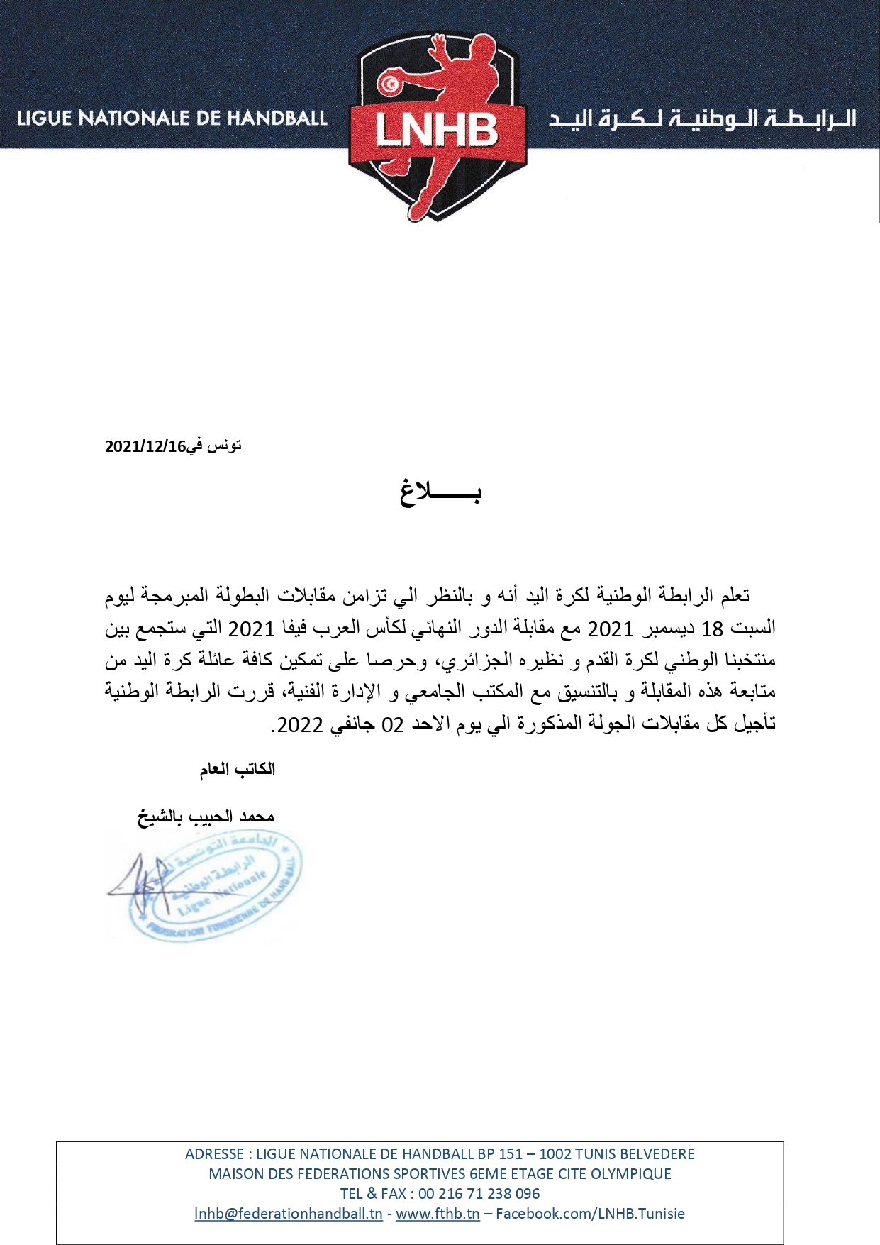 تأجيل كلّ المقابلات المبرمجة يوم السبت القادم ليوم الأحد 2 جانفي 2022 16 décembre 2021 Communiqués, Désignations, Featured, Les News de la FTHB, Photo, Publications Partager Facebook Twitter Google + Partager :Cliquez pour partager sur Twitter(ouvre dans une nouvelle fenêtre)Cliquez pour partager sur Facebook(ouvre dans une nouvelle fenêtre)Cliquez pour partager sur Google+(ouvre dans une nouvelle fenêtre) Articles similaires Partager Facebook Twitter Google +