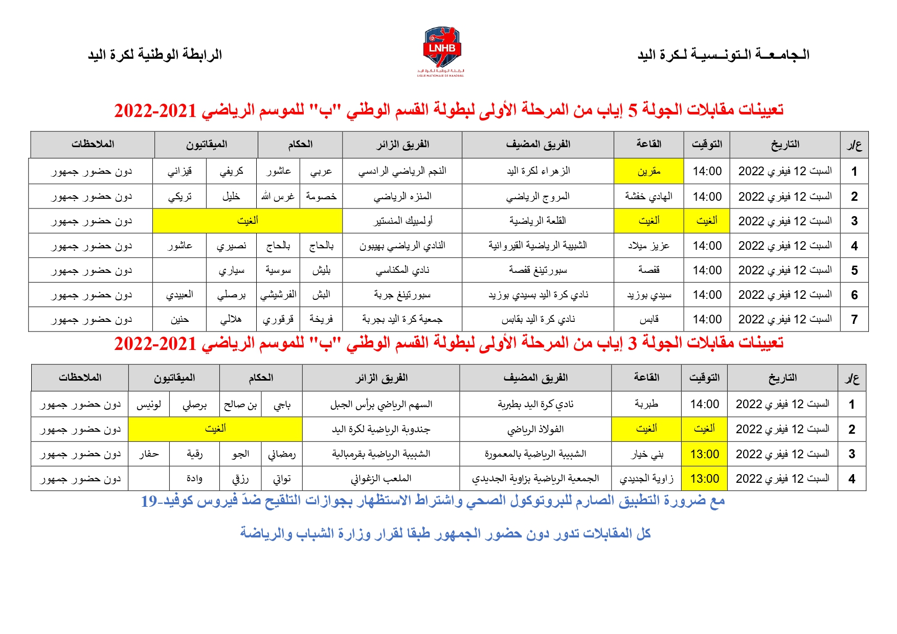 Championnat Nationale « B » : Désignation Arbitres 3ème et 5ème journée Retour (Samedi 12 février) 11 février 2022 Communiqués, Désignations, Featured, Les News de la FTHB, Photo, Publications Partager Facebook Twitter Google + Partager :Cliquez pour partager sur Twitter(ouvre dans une nouvelle fenêtre)Cliquez pour partager sur Facebook(ouvre dans une nouvelle fenêtre)Cliquez pour partager sur Google+(ouvre dans une nouvelle fenêtre) Articles similaires Partager Facebook Twitter Google +