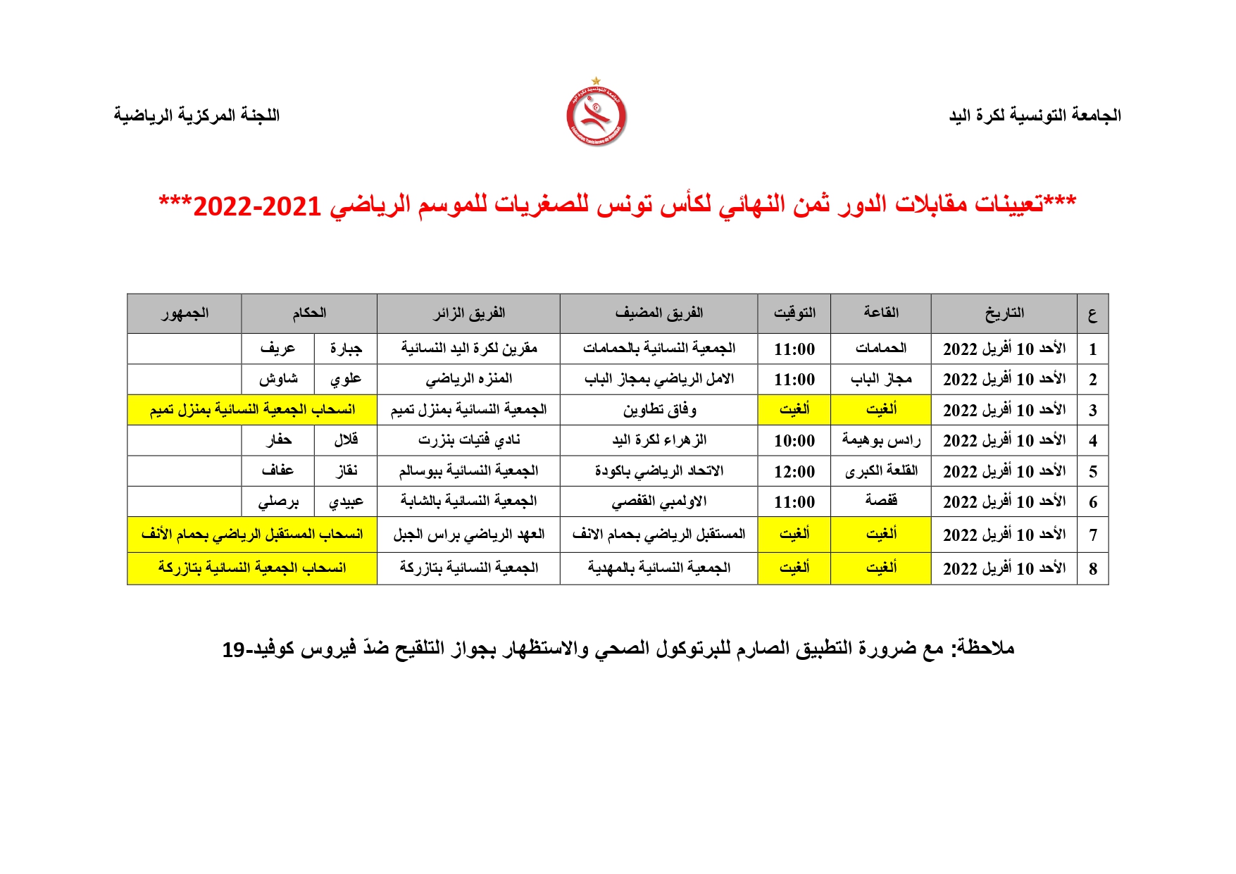 Désignation Arbitres Huitièmes de Finale Coupe de Tunisie Cadettes Filles (Dimanche 10 avril) 8 avril 2022 Communiqués, Désignations, Featured, Les News de la FTHB, Photo, Publications Partager Facebook Twitter Google + Partager :Cliquez pour partager sur Twitter(ouvre dans une nouvelle fenêtre)Cliquez pour partager sur Facebook(ouvre dans une nouvelle fenêtre)Cliquez pour partager sur Google+(ouvre dans une nouvelle fenêtre) Articles similaires Partager Facebook Twitter Google +