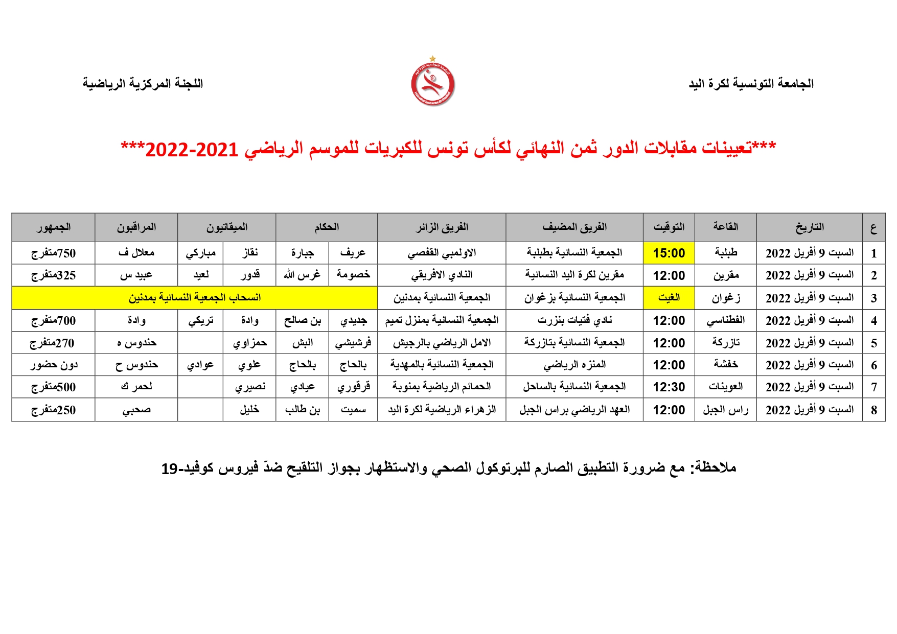 Désignation Arbitres Huitièmes de Finale Coupe de Tunisie Séniors Dames (Samedi 9 avril)