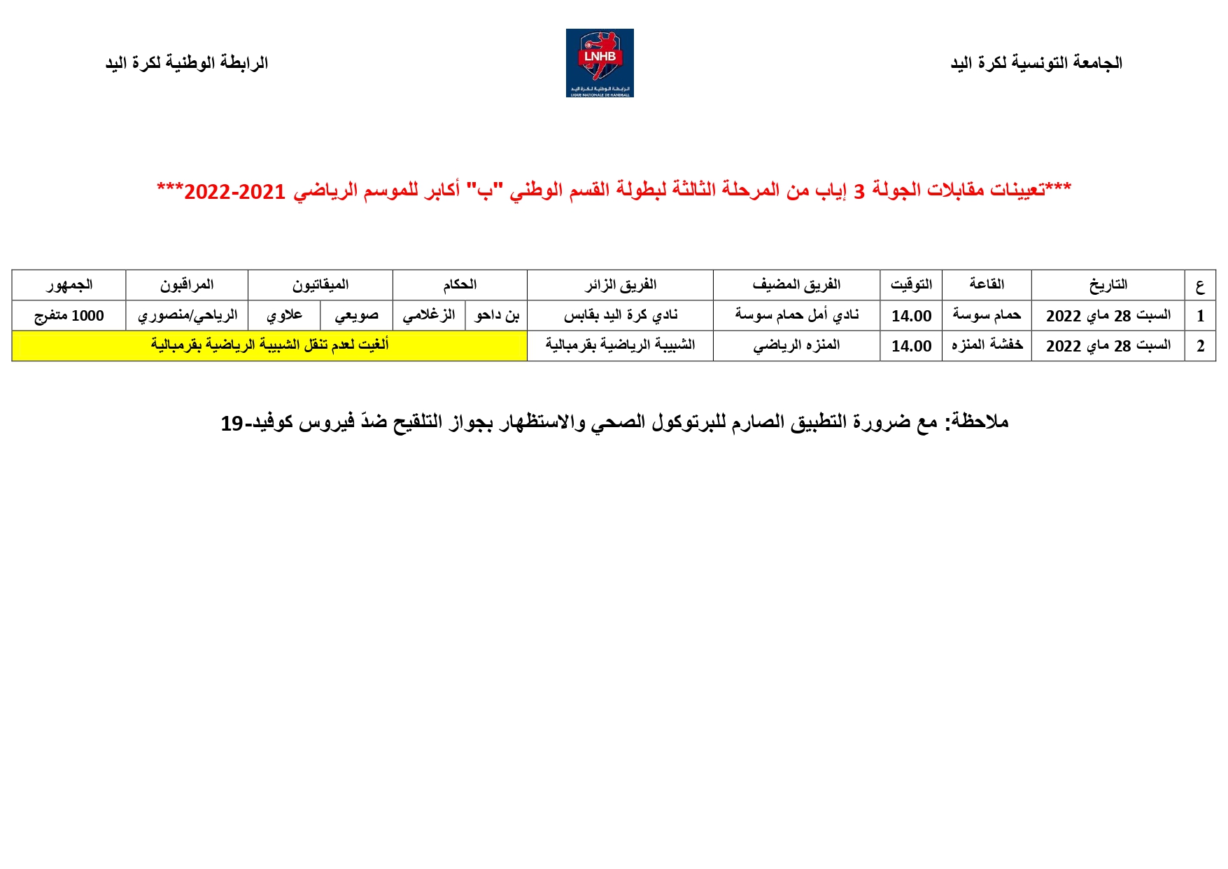 Nationale « B » Hommes : Désignation Arbitres 3ème journée retour PLAY-OFF (Samedi 28 mai) 27 mai 2022 Communiqués, Désignations, Featured, Les News de la FTHB, Photo, Publications Partager Facebook Twitter Google + Partager :Cliquez pour partager sur Twitter(ouvre dans une nouvelle fenêtre)Cliquez pour partager sur Facebook(ouvre dans une nouvelle fenêtre)Cliquez pour partager sur Google+(ouvre dans une nouvelle fenêtre) Articles similaires Partager Facebook Twitter Google +