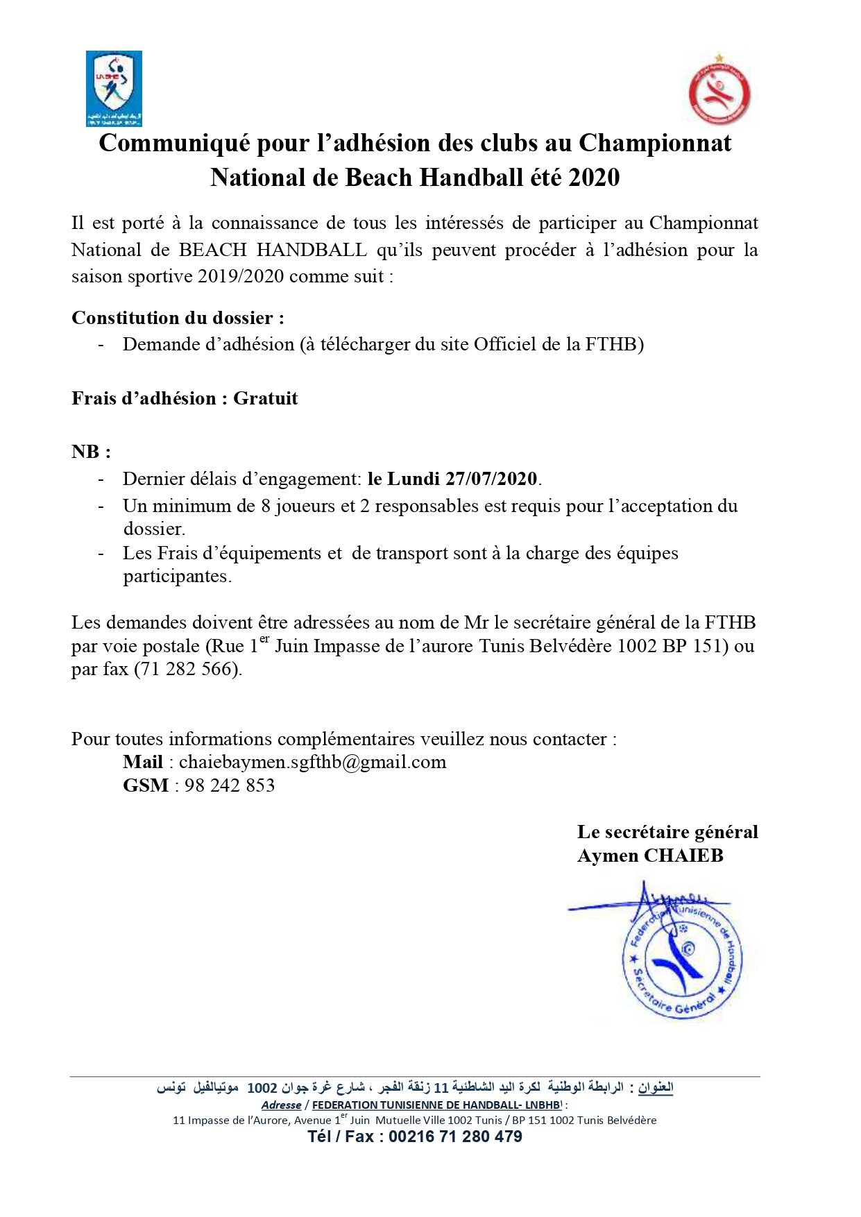 Communiqué : Adhésion au Championnat de Beach Handball 2020