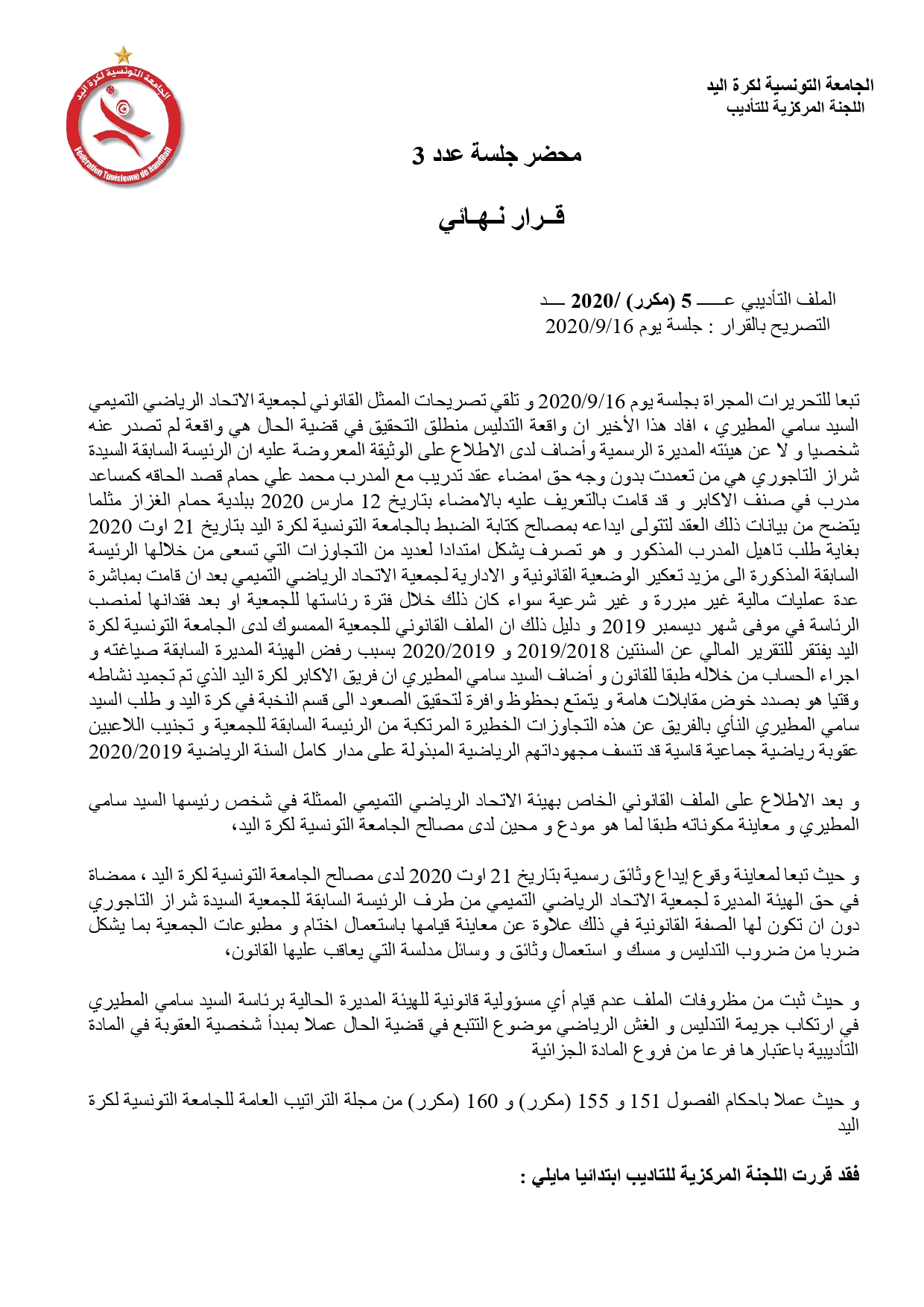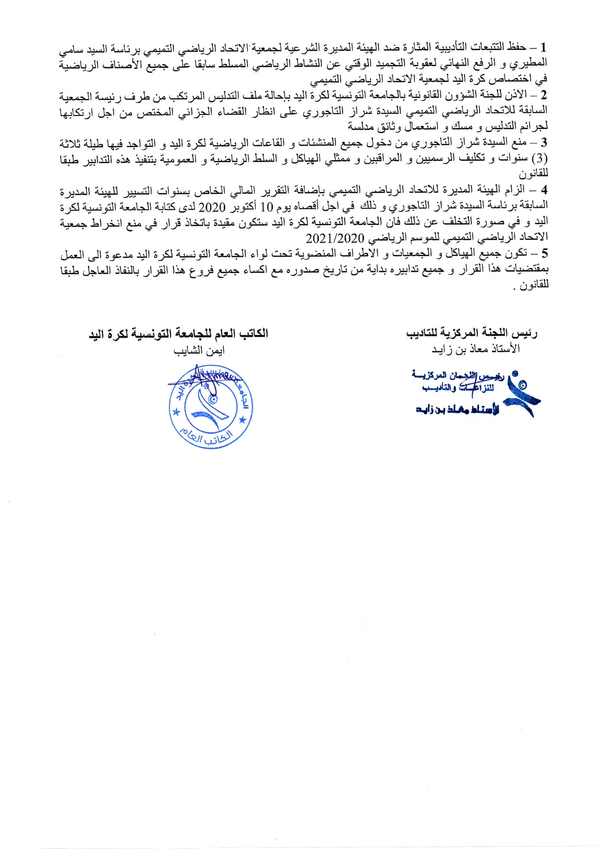 قرار اللجنة المركزية للتأديب بخصوص الوضعية القانونية و الادارية للاتحاد الرياضي التميمي 16 septembre 2020 Communiqués, Désignations, Featured, Les News de la FTHB, Photo, Publications Partager Facebook Twitter Google + Partager :Cliquez pour partager sur Twitter(ouvre dans une nouvelle fenêtre)Cliquez pour partager sur Facebook(ouvre dans une nouvelle fenêtre)Cliquez pour partager sur Google+(ouvre dans une nouvelle fenêtre) Articles similaires Partager Facebook Twitter Google +