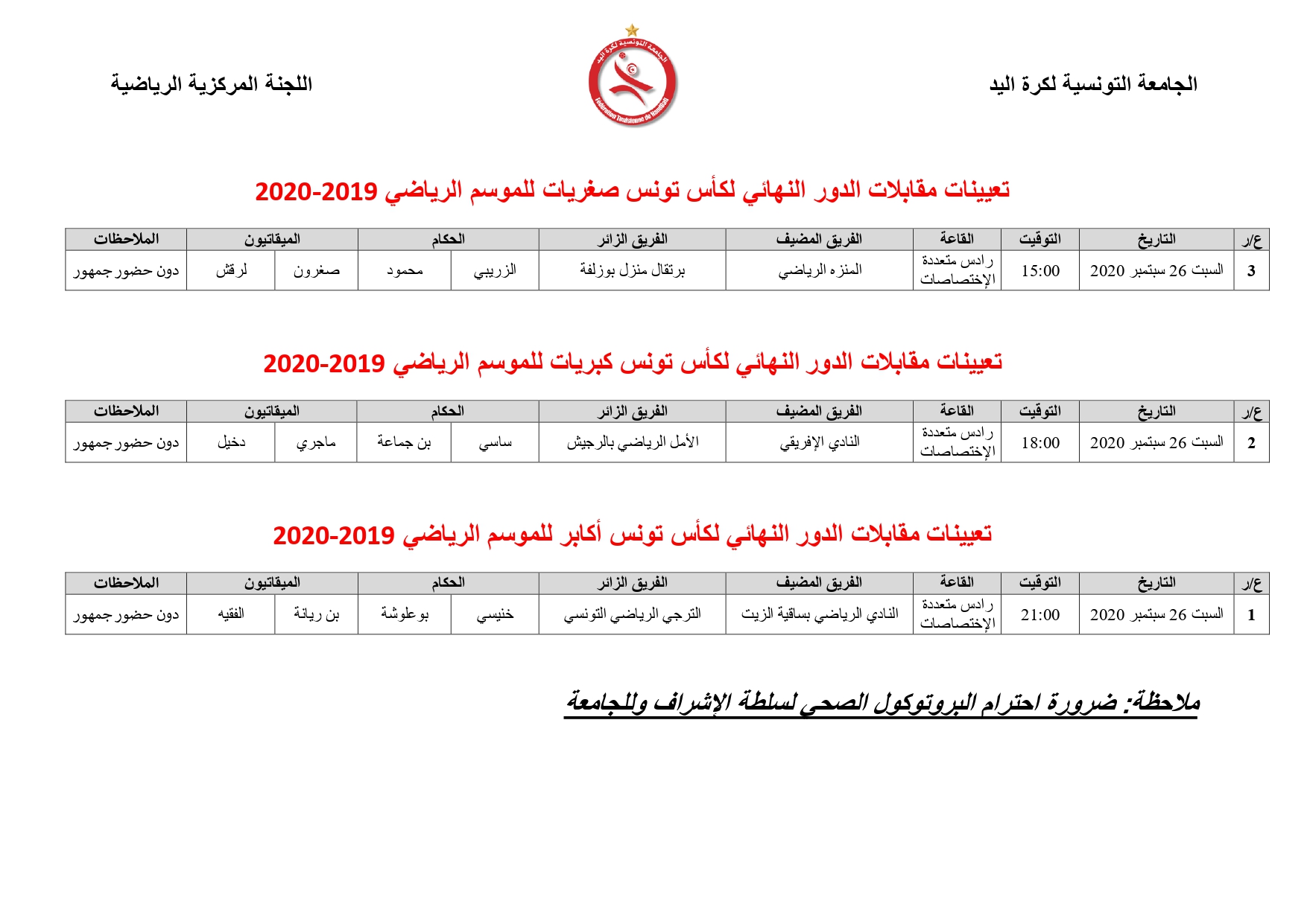 Désignation des Arbitres Finales Coupe de Tunisie Seniors Hommes, Dames et Cadettes