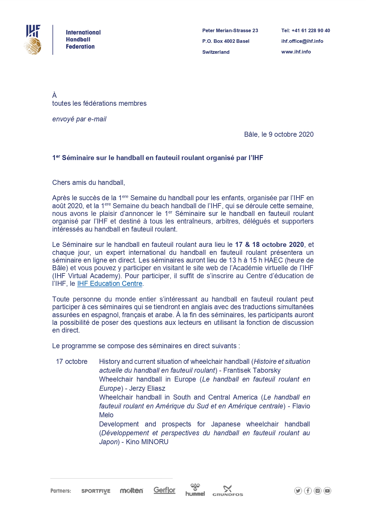 Inscription au premier séminaire en ligne du Handball en Fauteuil Roulant organisé par l’IHF
