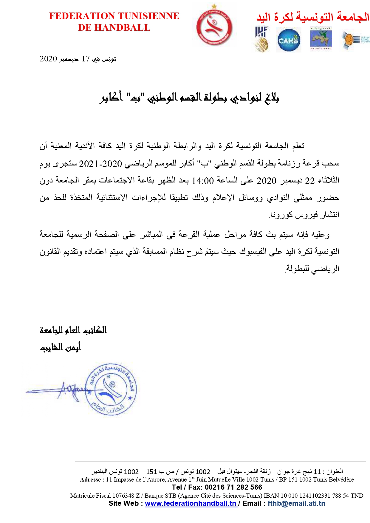 Communiqué : Tirage au Sort Calendrier Championnat Nationale « B » Hommes 2020-2021 17 décembre 2020 Communiqués, Désignations, Featured, Les News de la FTHB, Photo, Publications Partager Facebook Twitter Google + Partager :Cliquez pour partager sur Twitter(ouvre dans une nouvelle fenêtre)Cliquez pour partager sur Facebook(ouvre dans une nouvelle fenêtre)Cliquez pour partager sur Google+(ouvre dans une nouvelle fenêtre) Articles similaires Partager Facebook Twitter Google +