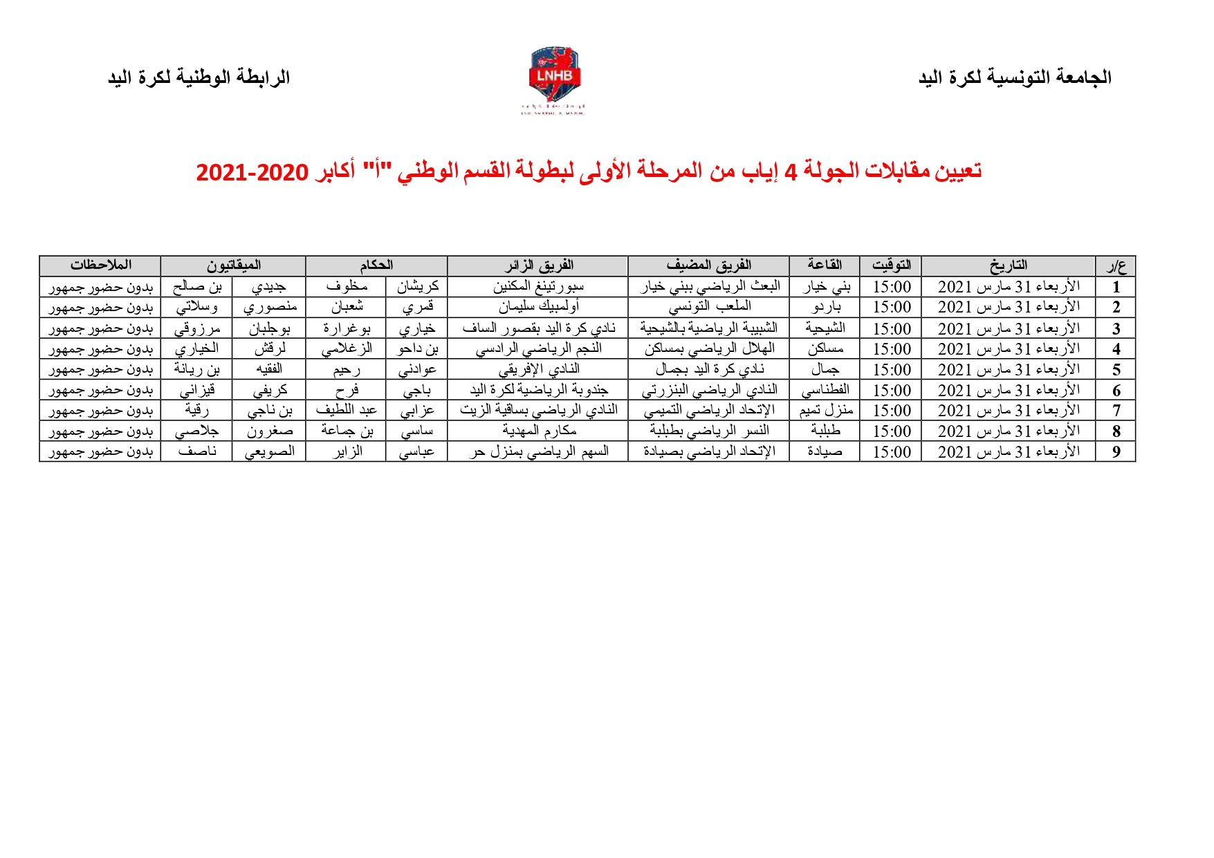 Nationale « A » Hommes : Désignation Arbitres 4ème journée retour (mercredi 31/03/2021)