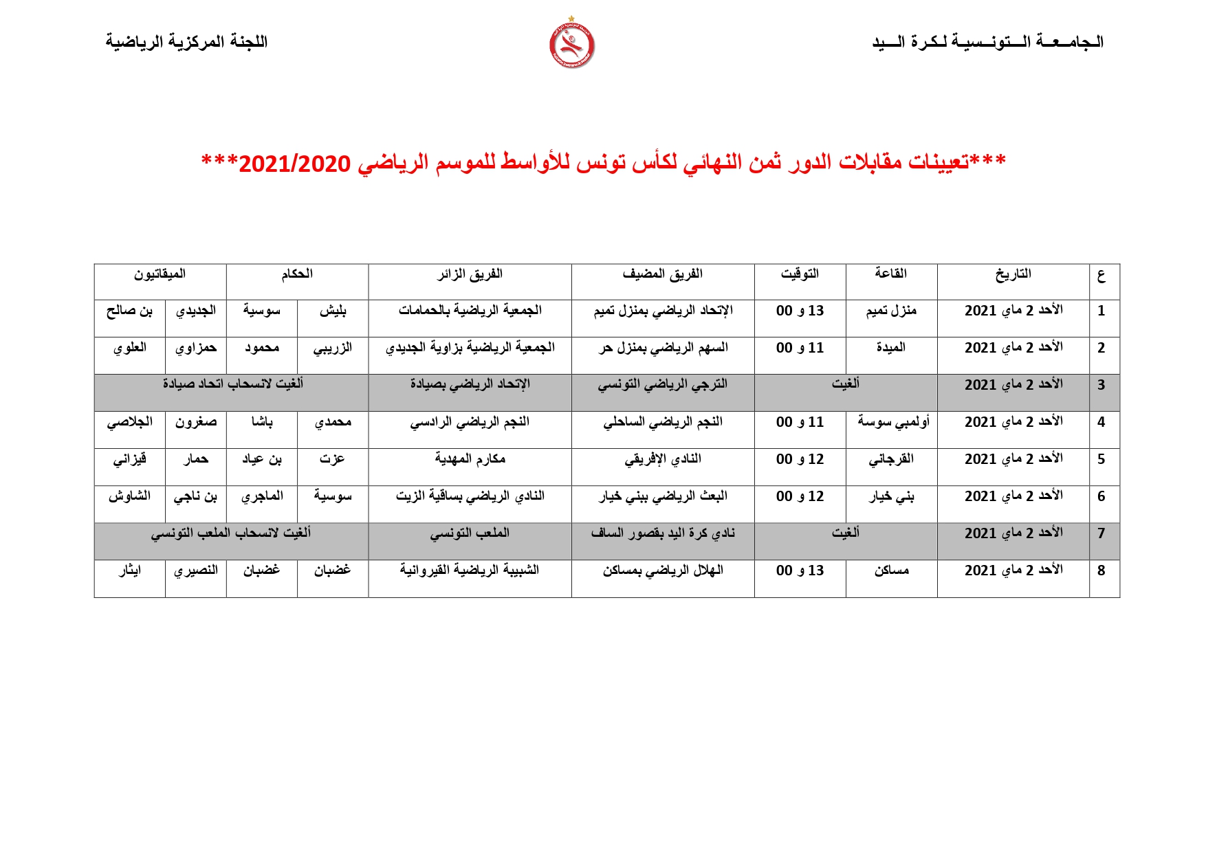 Désignation des Arbitres Huitièmes de Finale Coupe de Tunisie Juniors Garçons (Dimanche 02/05/2021) 28 avril 2021 Communiqués, Désignations, Featured, Les News de la FTHB, Photo, Publications Partager Facebook Twitter Google + Partager :Cliquez pour partager sur Twitter(ouvre dans une nouvelle fenêtre)Cliquez pour partager sur Facebook(ouvre dans une nouvelle fenêtre)Cliquez pour partager sur Google+(ouvre dans une nouvelle fenêtre) Articles similaires Partager Facebook Twitter Google +