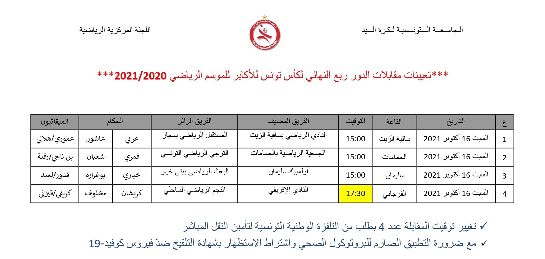 Désignation Arbitres Quarts de Finale Coupe de Tunisie Seniors Hommes (Samedi 16 octobre) 15 octobre 2021 Communiqués, Désignations, Featured, Les News de la FTHB, Photo, Publications Partager Facebook Twitter Google + Partager :Cliquez pour partager sur Twitter(ouvre dans une nouvelle fenêtre)Cliquez pour partager sur Facebook(ouvre dans une nouvelle fenêtre)Cliquez pour partager sur Google+(ouvre dans une nouvelle fenêtre) Articles similaires Partager Facebook Twitter Google +