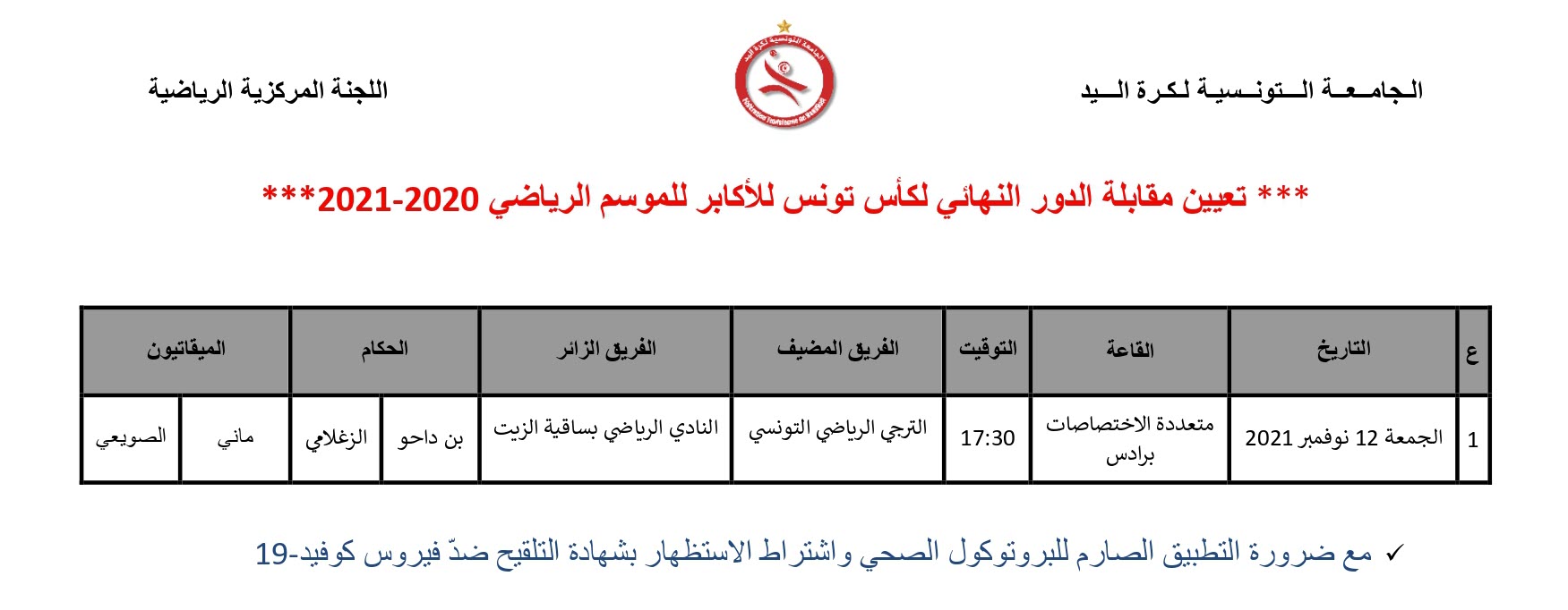Désignation Arbitres Finale Coupe de Tunisie Hommes 2020-2021 (Vendredi 12 novembre) 10 novembre 2021 Communiqués, Désignations, Featured, Les News de la FTHB, Photo, Publications Partager Facebook Twitter Google + Partager :Cliquez pour partager sur Twitter(ouvre dans une nouvelle fenêtre)Cliquez pour partager sur Facebook(ouvre dans une nouvelle fenêtre)Cliquez pour partager sur Google+(ouvre dans une nouvelle fenêtre) Articles similaires Partager Facebook Twitter Google +