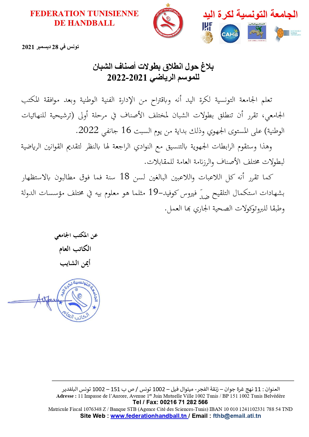 Communiqué : Démarrage des Championnats des Jeunes saison 2021-2022