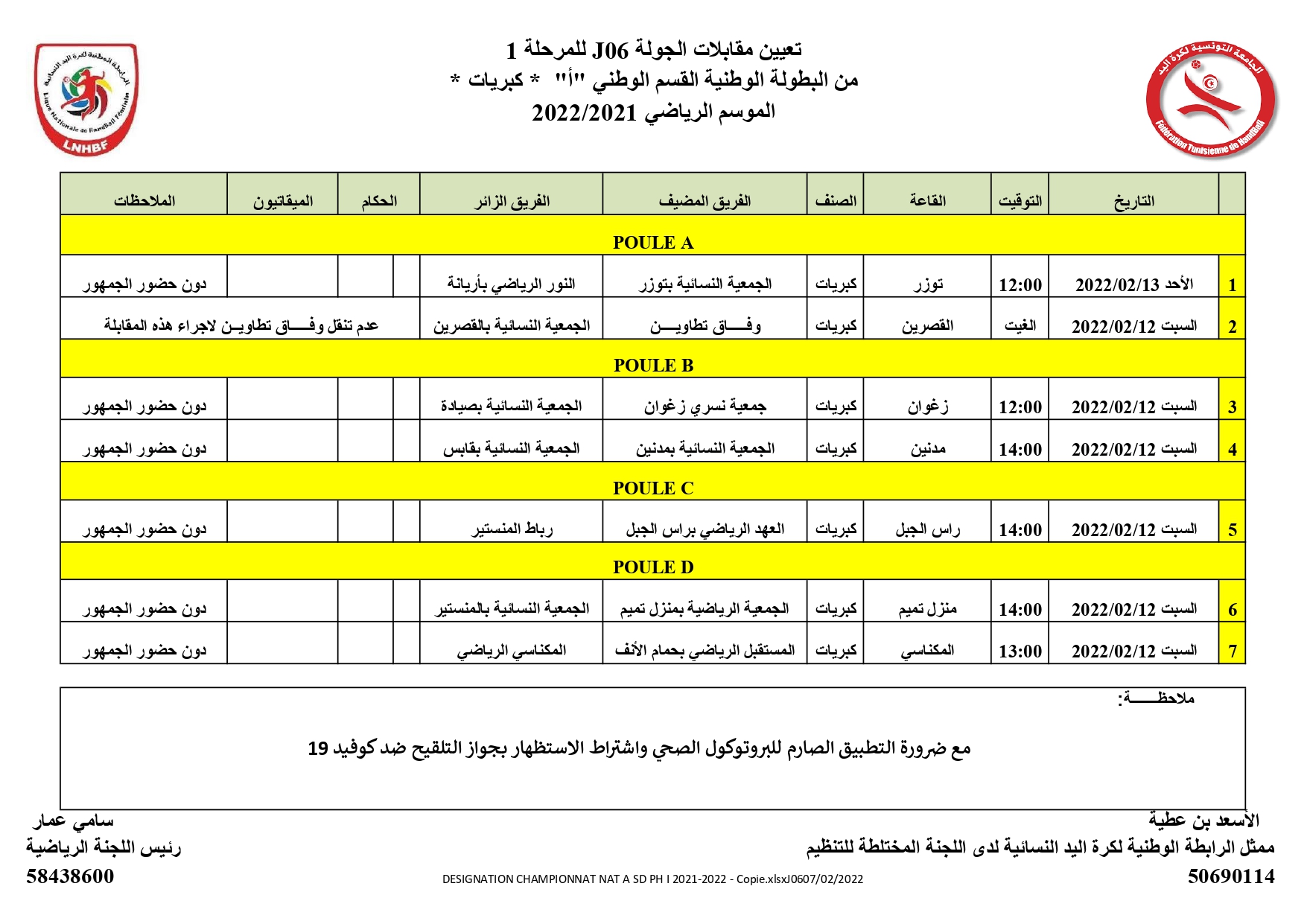 Championnat Nationale « A » Dames : Désignation Arbitres 6ème journée (Samedi 12 & Dimanche 13 février) 11 février 2022 Communiqués, Désignations, Featured, Les News de la FTHB, Photo, Publications Partager Facebook Twitter Google + Partager :Cliquez pour partager sur Twitter(ouvre dans une nouvelle fenêtre)Cliquez pour partager sur Facebook(ouvre dans une nouvelle fenêtre)Cliquez pour partager sur Google+(ouvre dans une nouvelle fenêtre) Articles similaires Partager Facebook Twitter Google +