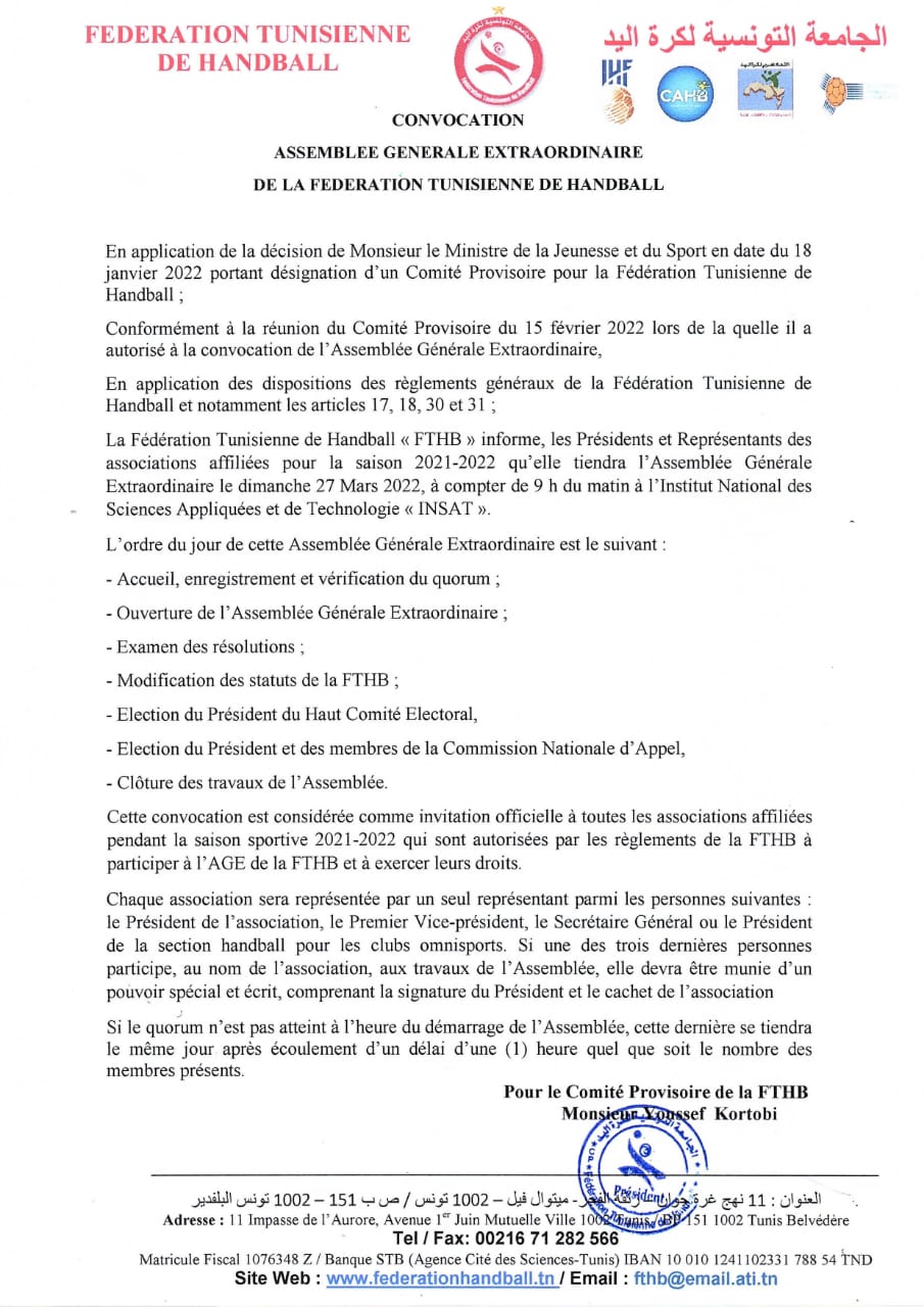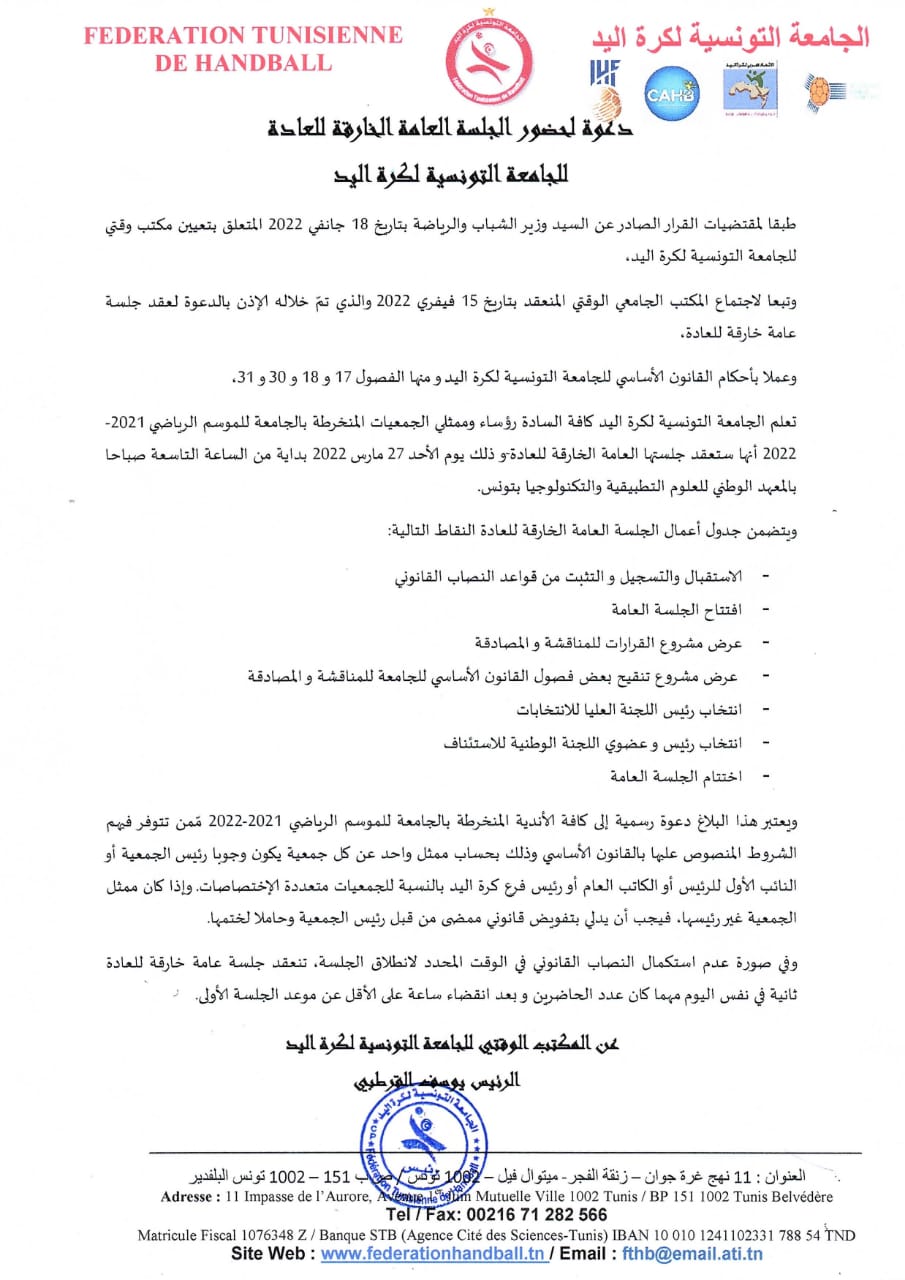 دعوة لحضور الجلسة العامة الخارقة للعادة للجامعة التونسية لكرة اليد 11 mars 2022 Communiqués, Désignations, Featured, Les News de la FTHB, Photo, Publications Partager Facebook Twitter Google + Partager :Cliquez pour partager sur Twitter(ouvre dans une nouvelle fenêtre)Cliquez pour partager sur Facebook(ouvre dans une nouvelle fenêtre)Cliquez pour partager sur Google+(ouvre dans une nouvelle fenêtre) Articles similaires Partager Facebook Twitter Google +