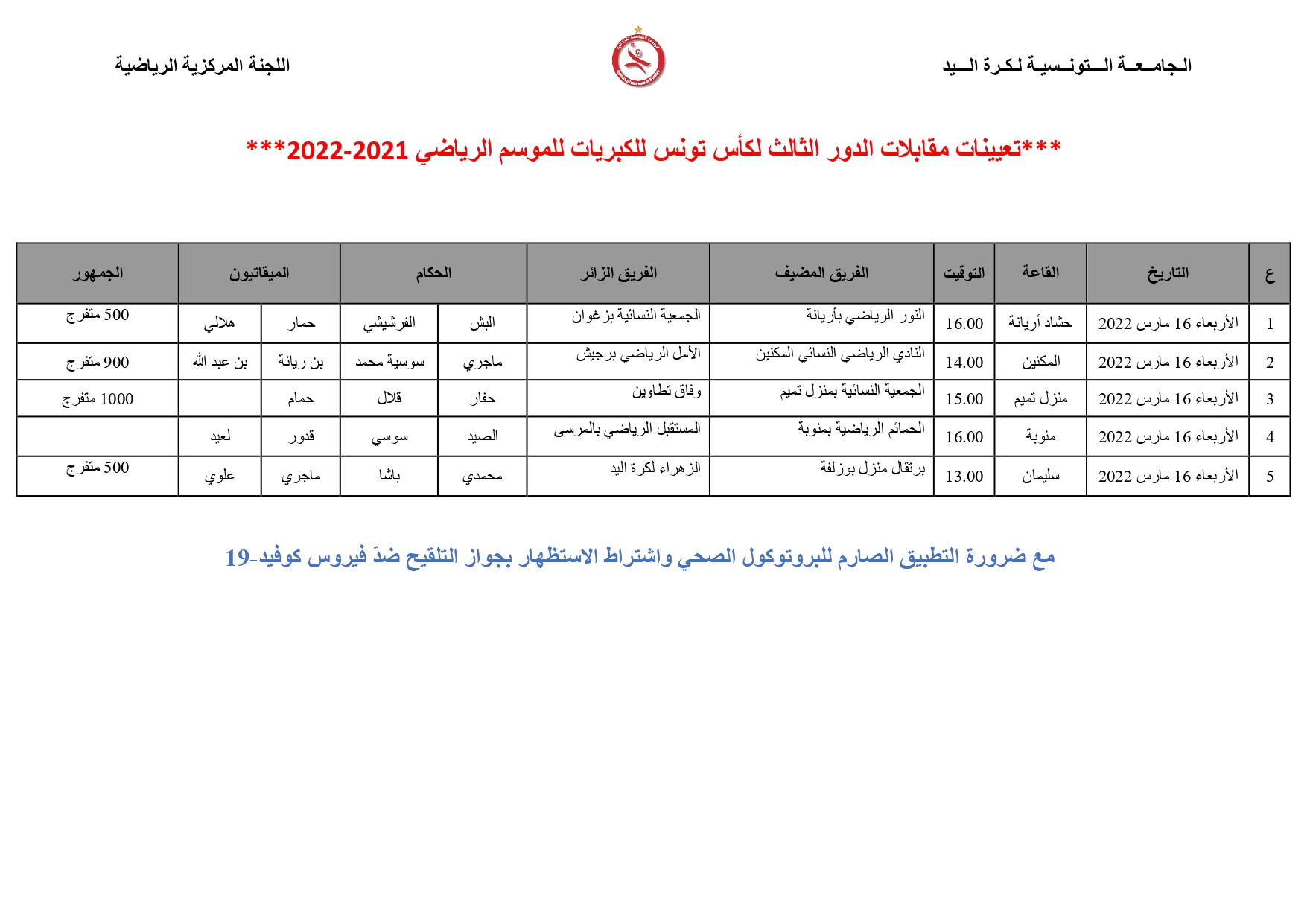Désignation Arbitres 3ème Tour Coupe de Tunisie Séniors Dames (Mercredi 16 mars)