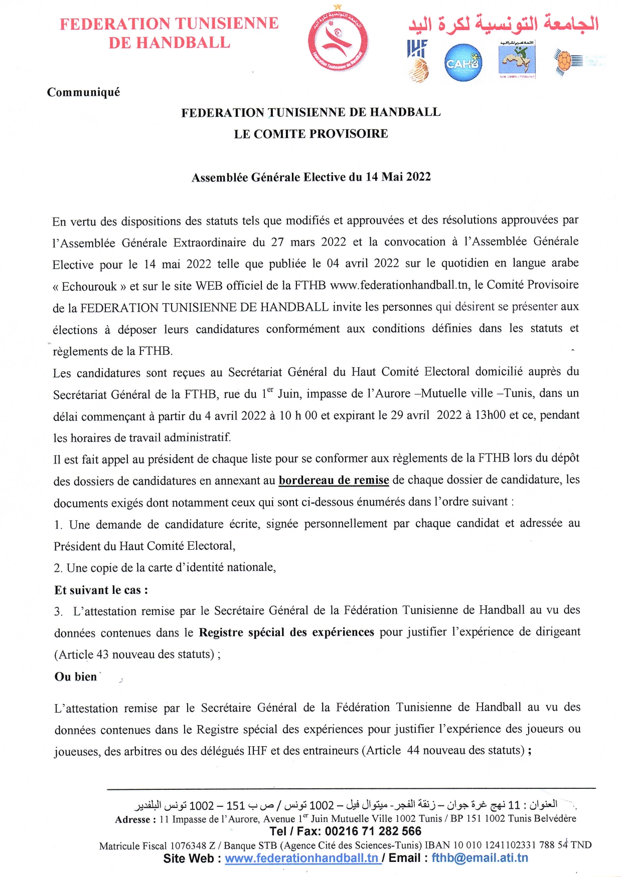 Communiqué : Appel à candidatures pour l’Assemblée Générale Elective du 14 mai 2022 5 avril 2022 Communiqués, Désignations, Featured, Les News de la FTHB, Photo, Publications Partager Facebook Twitter Google + Partager :Cliquez pour partager sur Twitter(ouvre dans une nouvelle fenêtre)Cliquez pour partager sur Facebook(ouvre dans une nouvelle fenêtre)Cliquez pour partager sur Google+(ouvre dans une nouvelle fenêtre) Articles similaires Partager Facebook Twitter Google +