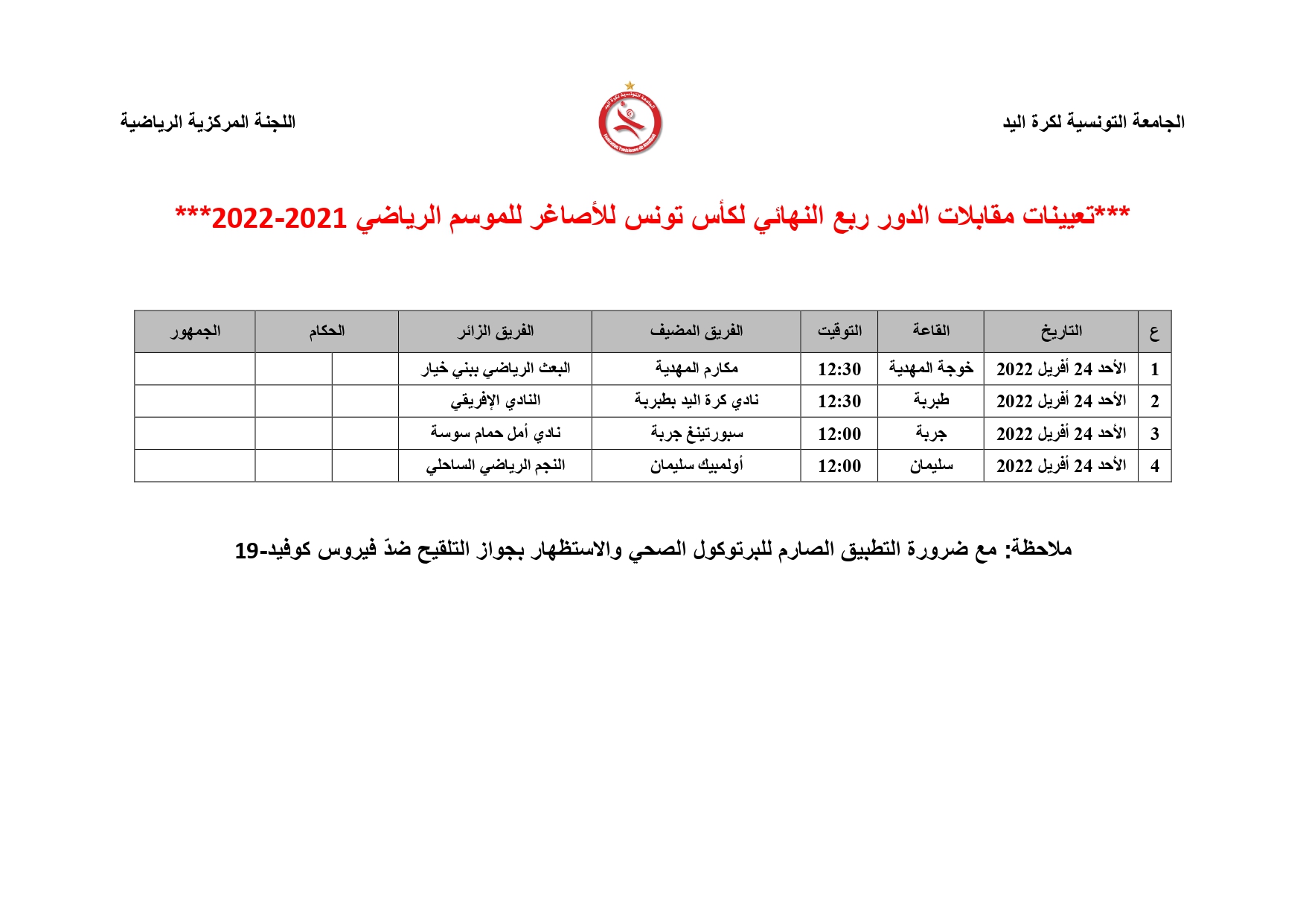 Coupe de Tunisie Cadets Garçons : Désignation Quarts de Finale (Dimanche 24 avril)